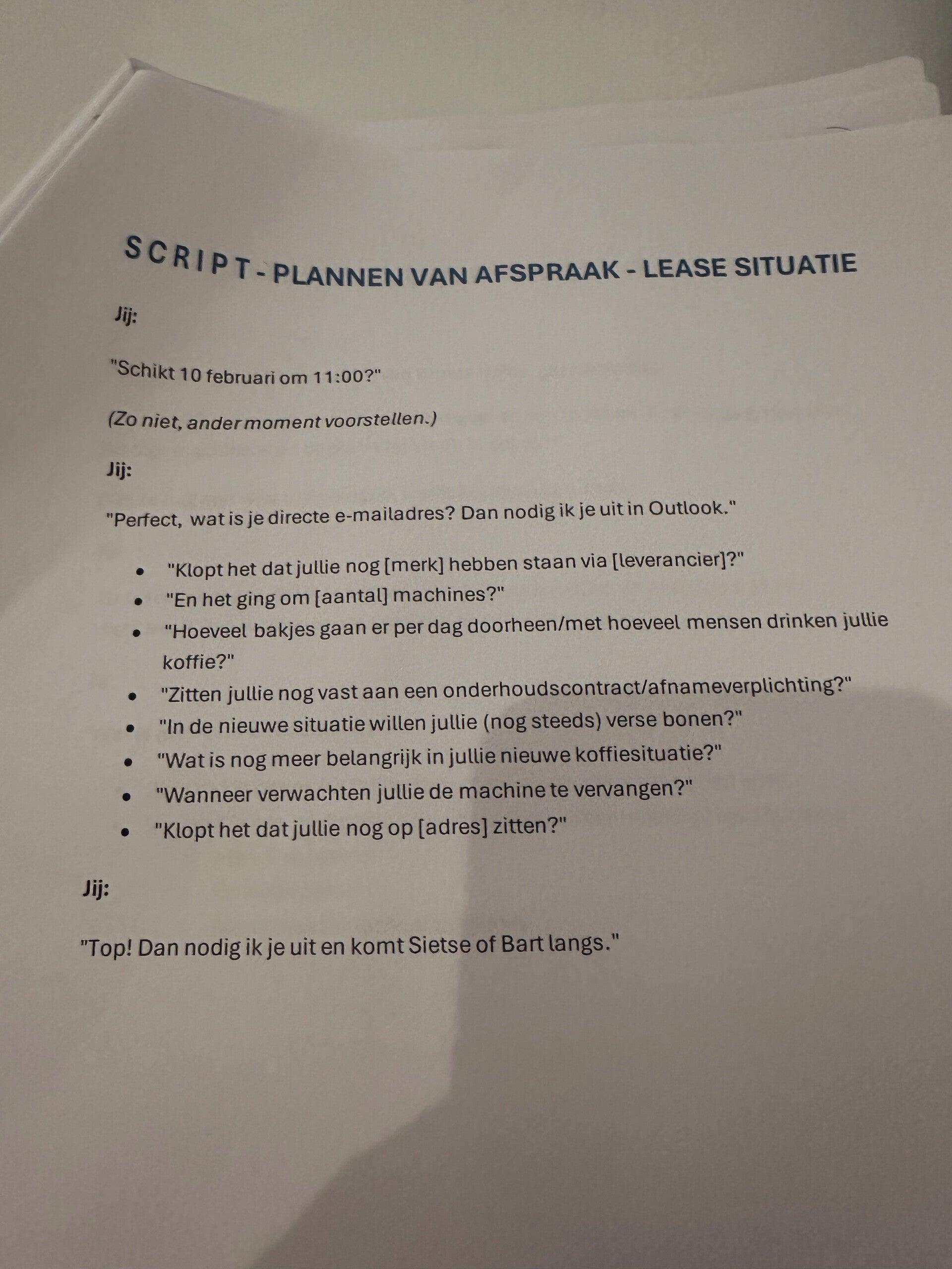 (0:00) Goedemorgen met Kalein. (0:02) Hé Kalein, goedemorgen met Thomas van de firma Broerskoffie. (0:05) Hé, goedemorgen.(0:07) Hé, leuk om je weer te spreken. (0:10) Ja. (0:11) Pas even, ik pak het heel even hier af en dan pak ik het even... (0:16) Ja, dan loop ik hier even van kantoor weg.(0:19) Kijk, wat heb ik nou... (0:24) O ja, hier ook. (0:31) Ik ben er bijna, sorry hoor. (0:33) Neem je tijd.(0:34) Ik loop heel eventjes van kantoor weg, anders krijg ik de rest... (0:40) Zodat iedereen mee luistert. (0:49) Yes. (0:50) Mooi.(0:53) En je had in de tussentijd een beetje gekeken dus? (0:56) Ik heb zeker wat rond gekeken.(0:59) Nou, mooi. (1:03) En ik ben ook eventjes verder gaan kijken.(1:05) Kijk, het ding is, ik heb gewoon best wel duidelijk wensen, laat ik het zo zeggen. (1:13) Kijk, wat ik al weet, ik wil gewoon twee uitlopen. (1:19) Ik wil verse melk.(1:20) Ik wil makkelijk optie decaf, dus niet hoeven te verschuiven, maar dus twee voor de koffiebonen. (1:30) Het moet dus best wel snel gaan. (1:32) Want ik heb vaak boekingen en dan zijn er gewoon twintig mensen die tussen tien en half elf een pauze hebben.(1:38) En die moeten gewoon eens een koffie krijgen. (1:40) Dus ik zit sowieso... (1:42) Nou, ik denk dat ik vermiddeld tussen de... (1:46) Kijk, het kan een dag zijn met tweehonderd koppen, maar ik denk gemiddeld zit ik hier op dertig koppen. (1:52) Dertig koppen per dag? (1:53) Ja.(1:54) Ja, en als je ons een uitgiet, zit je naar tweehonderd? (1:56) Ja, als ik dus zeg maar twintig...(1:59) Nee, wacht even, tweehonderd is te veel. (2:00) Tweehonderd keer... of zeg maar... (2:04) Twintig keer... (2:06) Vier... (2:07) Dacht ik. Nou, sorry, dat is tweehonderd een beetje... (2:09) Honderd, laten we zeggen, honderd.(2:12) Maar... (2:12) Ja. (2:13) Kijk, als ik een keer vijftig man heb, dan heb ik dus misschien wel...(2:16) Zit ik wel op honderdvijftig op een dag. (2:18) Dus die moet het wel aankunnen.(2:20) Ja, nou, dat is geen probleem. (2:21) Die Gemini van Espresso, die kan dat ook aan. (2:23) Dus volgens mij is dat niet het probleem.(2:27) Ik wil dus ook niet een apparaat dat keihard de hele tijd aan het malen is met die bonen.(2:32) Nee, snap ik. (2:33) Dus als die dan buitengebruik is, dat die dan ook stil is.(2:38) En een minimale schoonmaak in dat opzicht is dat die niet... (2:43) Als die zelfreinigend is, dat dat niet ineens midden op de dag gebeurt. (2:47) En dat het hele apparaat voor een half uur niet gebruikt kan worden. (2:50) Dus als die schoonmaakt is het... (2:55) Dan zou het eventueel einde dag zijn.(2:58) Of de melk, weet ik het. (3:00) Dan moet ik ze hier een beetje gaan opvoeden. (3:02) Of het doet op een andere manier.(3:04) Maar dat het dus de schoonmaak einde dag is. (3:07) En één keer in de zoveel tijd een groot schoonmaakje is, dat is niet het probleem. (3:10) Als ik dan van tevoren een waarschuwing krijg.(3:13) En dat die dan dus ook niet te lang duurt. (3:15) En dus het inhoud van het water minimaal vijf liter. (3:19) Nou, je hebt een hele lijstje hoor.(3:22) Ja, ik heb een hele lijstje. (3:23) Ik ben me er even in gaan verdiepen. (3:24) Ik hoor het.Ja, hartstikke fijn om te horen dit allemaal. (3:29) Ja, ik hoor allemaal geen problemen. (3:32) Deze wens kunnen wij gewoon meenemen naar de afspraak.(3:36) Dus ik zou zeggen, laten we lekker wat inplannen. (3:40) Maar ik wil even van je weten. (3:41) Want ik zie het bij jullie machines.(3:43) Waar zit jij dan nu aan te denken? (3:45) Want ik snap dat je het heel leuk vindt om hier te komen. (3:49) Maar kijk, ik wil een klein beetje weten. (3:52) Wat staat me te wachten? (3:54) Wat kunnen jullie bieden? (3:55) Want vooralsnog heb ik nog niet zoveel van jou gehoord.(3:58) Nee, precies. (3:59) Nee, hoe het gaat. (4:01) Deze informatie nemen wij dan natuurlijk mee.(4:03) En dan ga ik samen met accountmanagers zitten. (4:07) Die er nog eigenlijk veel meer verstand van hebben dan ik. (4:10) Want dat zijn echt complete koffie-kenners.(4:13) Die leven eigenlijk tussen de bonen. (4:15) Nou, die weten natuurlijk ook precies welk apparaat dan het beste voor jou zal zijn. (4:20) En ik doe eigenlijk gewoon het hele verhaal, leg ik bij hun neer.(4:22) Die gaan dan met een goed voorstel naar jou toe komen. (4:27) En dan is het aan jou of jij je er goed bij voelt en vertrouwen in hebt. (4:31) En vanaf daar maak jij dan uiteindelijk de reuze.(4:34) Dus het is niet dat als ik langskom dat jij gelijk je brieven moet neerleggen op tafel. (4:38) En er is geen weg meer terug, zeg maar. (4:40) Nee, precies.Dat is vrijblijvend. (4:43) Want de apparaten die op jullie website staan nu, zijn dat het enige wat jullie hebben? (4:48) Of ze komen nog met wat anders? (4:50) Nou, als je echt een specifiek apparaat in je hoofd hebt, dan kunnen we dat natuurlijk ook gewoon regelen. (4:55) Dit zijn een beetje gewoon onze koffiemachines die het meest bekende zijn, het meest gebruikt worden.(5:03) Ik weet niet, had jij dan een specifiek apparaat op oog? (5:06) Nou, ik zit nu naar de Jura X8 te kijken. (5:10) Maar jullie hebben maar alleen Giga staan. (5:12) En dan wil ik daar even... (5:14) Nou, misschien moet ik gewoon het versprek aangaan.(5:16) Ik weet niet hoe jullie vandaan moeten komen, maar... (5:21) Ja, dat is helemaal geen probleem. Daar hebben we agendas voor en auto's voor. (5:25) Ja, precies.(5:27) En dan had ik trouwens nog één eis met Anne. (5:30) Nou, Wens, laat ik Wens noemen.(5:32) Hij moet ook verplaatst worden vanwege boekingen.(5:36) Dus hij staat meestal in de keuken, maar als ik een keer een event heb of vergaderingen, dan moet hij naar een andere locatie. (5:43) Dus hij moet ook niet te zwaar zijn. (5:46) Nee, nee, dat snap ik.Het zijn geen mega zware dingen, dat is allemaal wel te doen. (5:51) Oké. (5:52) Dus nou ja, wat ik zei, ik hoor helemaal geen problemen.(5:56) Heel fijn. En dan zou ik, want we hebben dus nu een apparaat, maar dat is de Gemini van Espresso en er is één uitloop kapot. (6:04) Oh.(6:05) Het v